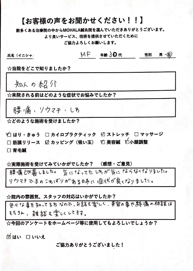 徐々に腰痛やリウマチの症状が改善していき、喜んでもらえているのが嬉しいです。