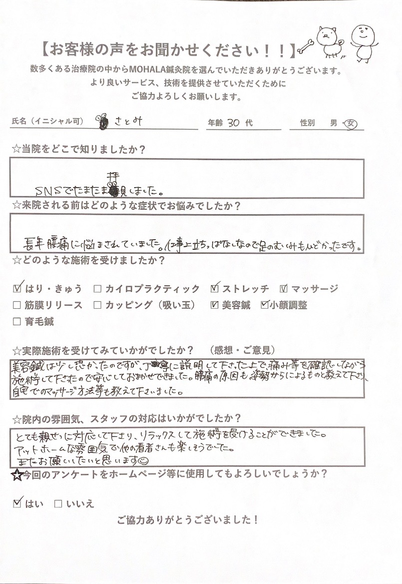 腰痛の原因も姿勢からによるものと教えて下さり、自宅でのマッサージ方法等も教えて下さいました。