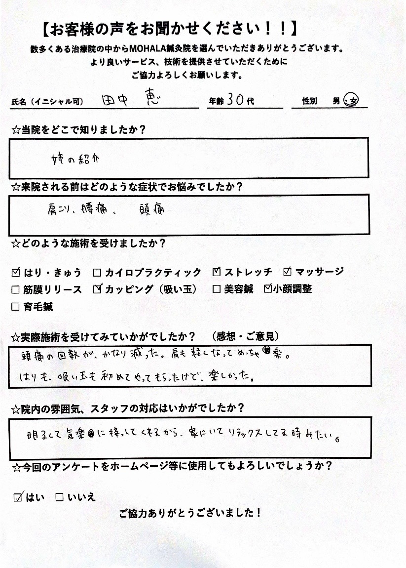 A. 頭痛の回数がかなり減り、肩も軽くなってめっちゃ楽。