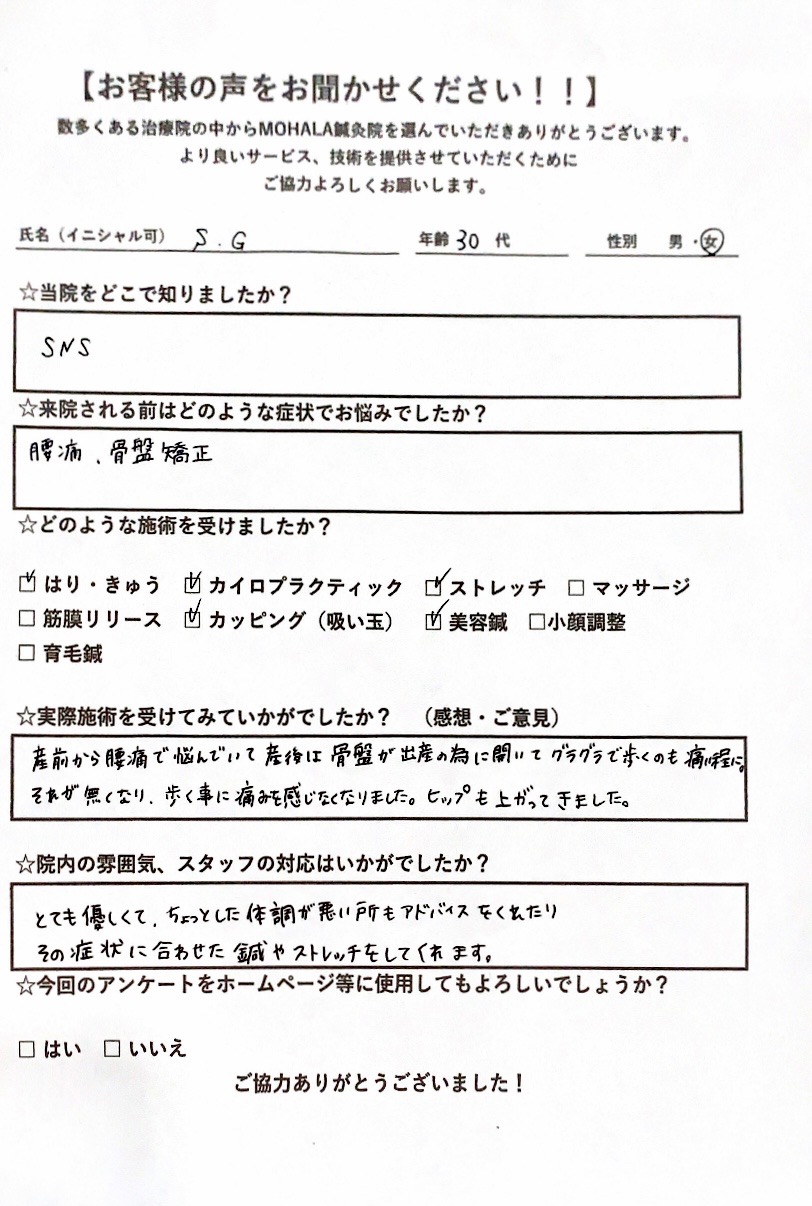 A.産前から腰痛で悩んでいて、産後は骨盤が出産の為に開いてグラグラで歩くのも痛い程に。