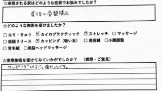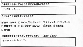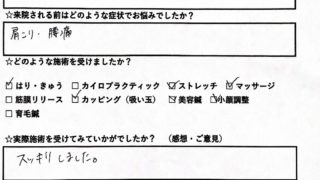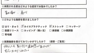 ☆アンケート☆お客様の声 ⚪︎当院はどこで知りましたか?A. 姉の紹介⚪︎来院される前はどのような症状でお悩みでしたか?A. 首こり・肩こり⚪︎どのような施術を受けましたか? A.はり・きゅう、ストレッチ、マッサージ、筋膜リリース⚪︎実際施...